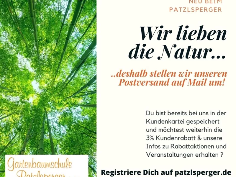 ab sofort können Sie sich hier auf der Seite registrieren lassen und den Newsletter abonnieren. Alles was Sie dazu machen müssen ist bei der Registrierung hier auf unserer Homepage ein Häkchen in der Checkbox "Für den Newsletter anmelden" setzen und schon sind Sie registriert sind immer auf dem Laufenden. Ob Rabattaktionen oder Veranstaltungen, sie werden immer per E-Mail informiert und verpassen so nichts mehr rund um die Gartenbaumschule Patzlsperger.