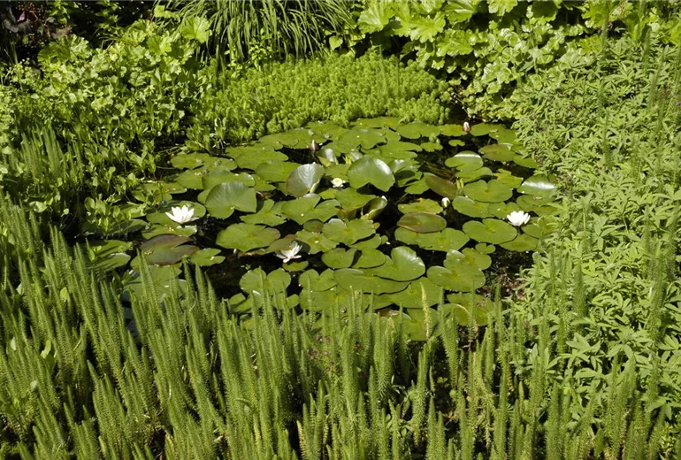 Vor allem Seerosen sind bei Teichbesitzern besonders beliebt. Und auch, wenn die außergewöhnlich schönen Blüten einen sehr zarten Eindruck machen, ist die Seerose hart im Nehmen. Wasserpflanzen zurückschneiden, das gilt auch für Seerosen, sollte man immer dann, wenn die Pflanzen zu viel Fläche einnehmen. Aber auch, wenn Seerosen nicht mehr blühen, wird es Zeit für einen Rückschnitt. Während man andere schwimmende Wasserpflanzen einfach aus dem Teich nehmen kann, muss bei Seerosen die Astschere ran. Mit der durchtrennt man so bodennah wie möglich die Stiele der Pflanze. Die abgeschnittenen Teile müssen aus dem Wasser genommen werden, damit sie nicht verrotten. Aber nicht nur im Teich fühlen sich Pflanzen wohl, auch drumherum ist viel los. Sumpfpflanzen am Teichrand sollte man bei Bedarf auch immer wieder zurückschneiden, damit ein aufgeräumtes und harmonisches Bild entsteht. Wasserpflanzen zurückschneiden ist nicht so schwer, wie anfangs vielleicht gedacht und mit den richtigen Mitteln und ein paar geübten Handgriffen kann man den eigenen Teich immer frisch und gesund halten. Da macht es doch gleich noch viel mehr Spaß, sich nach getaner Arbeit am Gartenteich zu entspannen, oder?